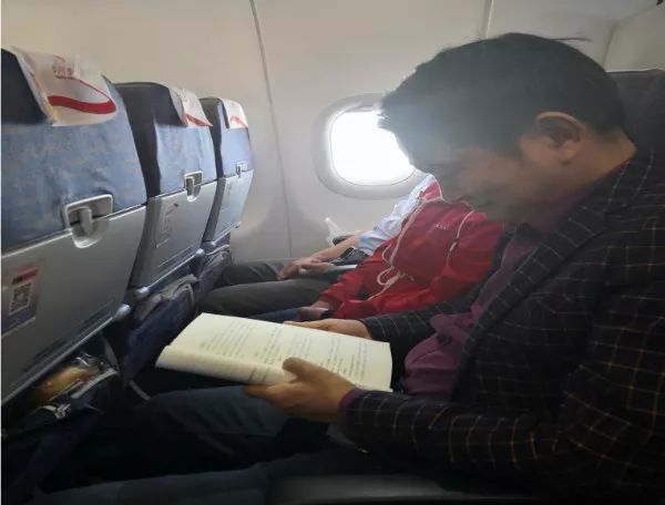 飛機(jī)上,窗外的雪景讓人動(dòng)心。窗內(nèi)的景致也讓人動(dòng)情——曾良策校助、邢斌老師、楊乾海老師、黃俊老師都利用碎片時(shí)間看書(shū)。特別讓我們感到神奇的是,飛機(jī)上一位素不相識(shí)的空姐,看到認(rèn)真閱讀的曾校助,居然非常崇拜地蹲下來(lái)求他簽字留言,成為曾校助又一個(gè)空姐粉絲。