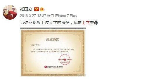 前年,64歲的演員張國(guó)立憑借自己的努力,自學(xué)考生,成功考上清華大學(xué)五道口金融學(xué)院,在收到錄取通知書(shū)后,第一時(shí)間在微博上分享了自己的喜悅,并配文“為彌補(bǔ)我沒(méi)上過(guò)大學(xué)的遺憾,我要上學(xué)去”。